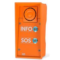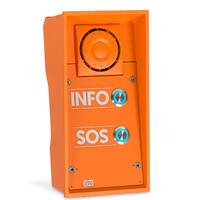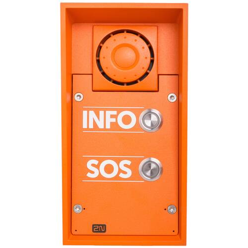 2N, Helios IP Safety vandal resistant outdoor module with 2 backlit push buttons and 10 Watt dual loudspeaker, push buttons labeled INFO and SOS, PoE/12 VDC.