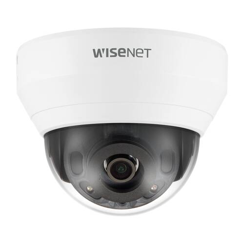 Wisenet Q Network Indoor IR Dome Camera, 4MP @30fps, 3.6mm Fixed Lens, H.265/H.264/MJPEG w/ WiseStream, Multiple Streaming, 120dB WDR, True Day & Night (ICR), IR Visible length 20 m, Motion detection, Tampering, Defocus detection, Corridor view, 1-way audio and microSD/SDHC/SDXC slot, LDC (Lens Distortion Correction) support, PoE/12VDC; RAL9003.