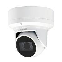 Wisenet Q network outdoor vandal flateye camera, 4MP @20fps, motorized vari-focal lens 3.1x (3.2 ~ 10.0mm) (100.0°~30.5°), triple codec H.265/H.264/MJPEG with Wisestream, 120dB WDR, IR LEDs range 98', defocus detection, hallway View, one way audio and SD card. IP66, IK10, PoE/12VDC, white color. Flateye style prevents IR reflections, provides better image in rain, and is easy to adjust.