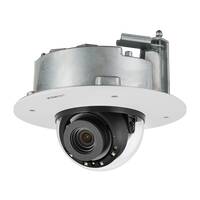 The Wisenet X series PLUS powered by Wisenet 5 network indoor flush mount dome camera features a modular structure, 5MP @ 30fps, motorized vari-focal lens 2.6x (3.6~9.4mm) (102.5°~38.7°). 164 foot IR viewable range for low light/no light monitoring. Triple codec H.265/H.264/MJPEG with WiseStream II technology reduces bandwidth and storage requirements. Additional features include 120dB WDR, USB port for easy installation, advanced video analytics, sound classification and business analytics, shock detection, audio playback, true D/N, dual SD card, hallway view, HLC, fog detection, DIS (Gyro), 12VDC/PoE, IP52, plenum-rated, white color. The modular design allows for easy installation of the camera case separately from the camera module. In addition, the camera module box includes a cutout for easy configuration without disassembling the camera/case.