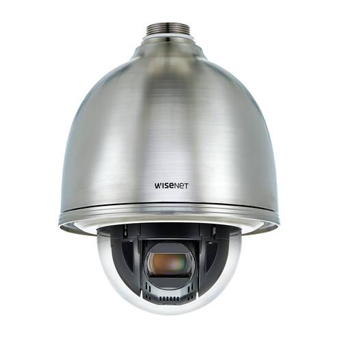 Wisenet X powered by Wisenet 5 network stainless steel PTZ camera, 2MP, Full HD(1080p) @ 60fps, 32X optical zoom lens (4.44 ~142.6mm) (61.8° ~ 2.19°), Pan: 360° endless. Tilt: -15°~ 195°, triple codec H.265/H.264/MJPEG with WiseStream II technology, 150dB WDR, USB port for easy installation, advanced video analytics and sound classification, true D/N, dual SD card, HLC, defog detection, DIS(Gyro),24VAC/PoE+, IP66/IK10, -58°F ~ +131°F W/ 24VAC power supply