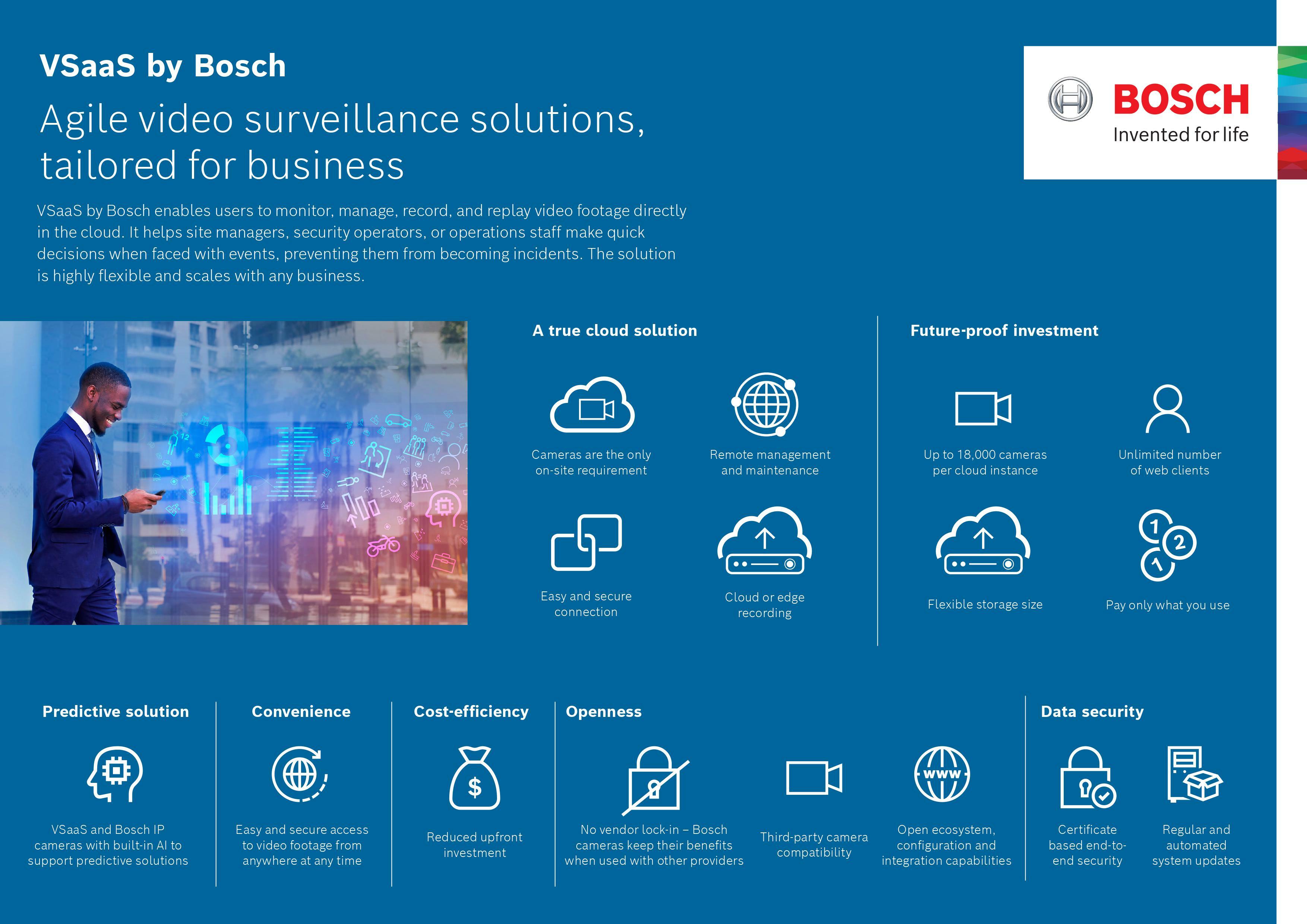 VSaaS by Bosch enables users to monitor, manage, record, and replay video security footage directly in the Cloud from anywhere. It helps site managers, security operators, or operations staff make quick decisions, especially from remote locations, when faced with events, preventing them from becoming incidents.