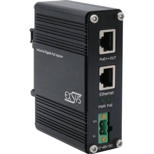 The Gigabit Ethernet PoE Injector EX-60315 features a robust metal housing and enables the power supply for end devices such as IP telephones, IP cameras, WLAN access points, and more via the network cable. It supports PoE standards IEEE 802.3af (PoE), IEEE 802.3at (PoE+), and IEEE 802.3bt (PoE++) with a maximum power output of up to 90W on the PoE port. Power is provided through a +12~48V terminal block, using an optional external power supply.