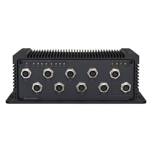 Mobile PoE switch 8 ports (M12 D-code) + 2 uplink ports (M12 A-code), PoE budget 64W, Camera PoE extender for TRM-1610M, Camera PoE extender for TRM-1610S (SPN-10080P), fan less design, 9-36VDC, -40°F ~ +167°F.