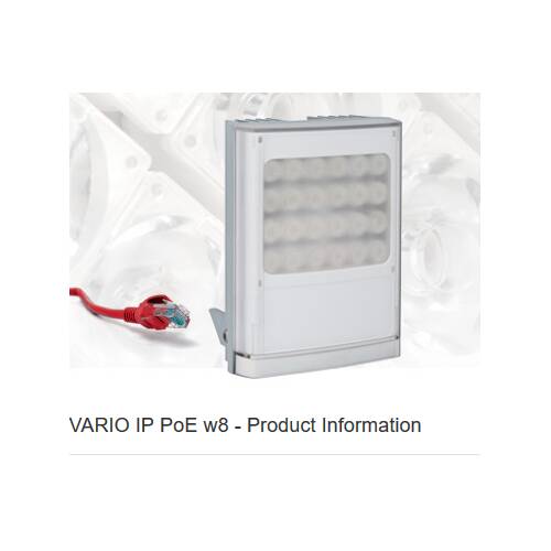 The VARIO IP PoE w4 series of network illuminators is a new range of fully IP controllable White-Light illuminators designed for all CCTV applications and general area illumination. VARIO IP offers the ultimate flexibility in terms of power input including both PoE (at standard PoE+) or low voltage (24V DC).