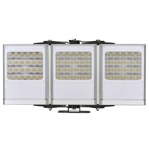 Delivering world leading power and illumination distances VARIO2 next generation illuminators can improve the performance of any video surveillance system at night. VARIO2 illuminators use PLATINUM Elite SMT LED technology to deliver more power and greater distances from a smaller platform than current generation illuminators. Providing a broader range of solutions, the VARIO2 series also offers a suite of advanced security features for easier programming and safer operation of smart lighting systems. VARIO2 features an interchangeable lens system with Hot-spot Reduction Technology, and Adaptive Illumination™ on double and triple panel models to deliver highly even illumination, where it is most needed, for outstanding night-time images. With the optional hand-held remote control, VARIO2 also makes installation and commissioning quicker, easier and safer. The VARIO2 w8-3 White-Light series delivers maximum distances up to 311m (1020ft).