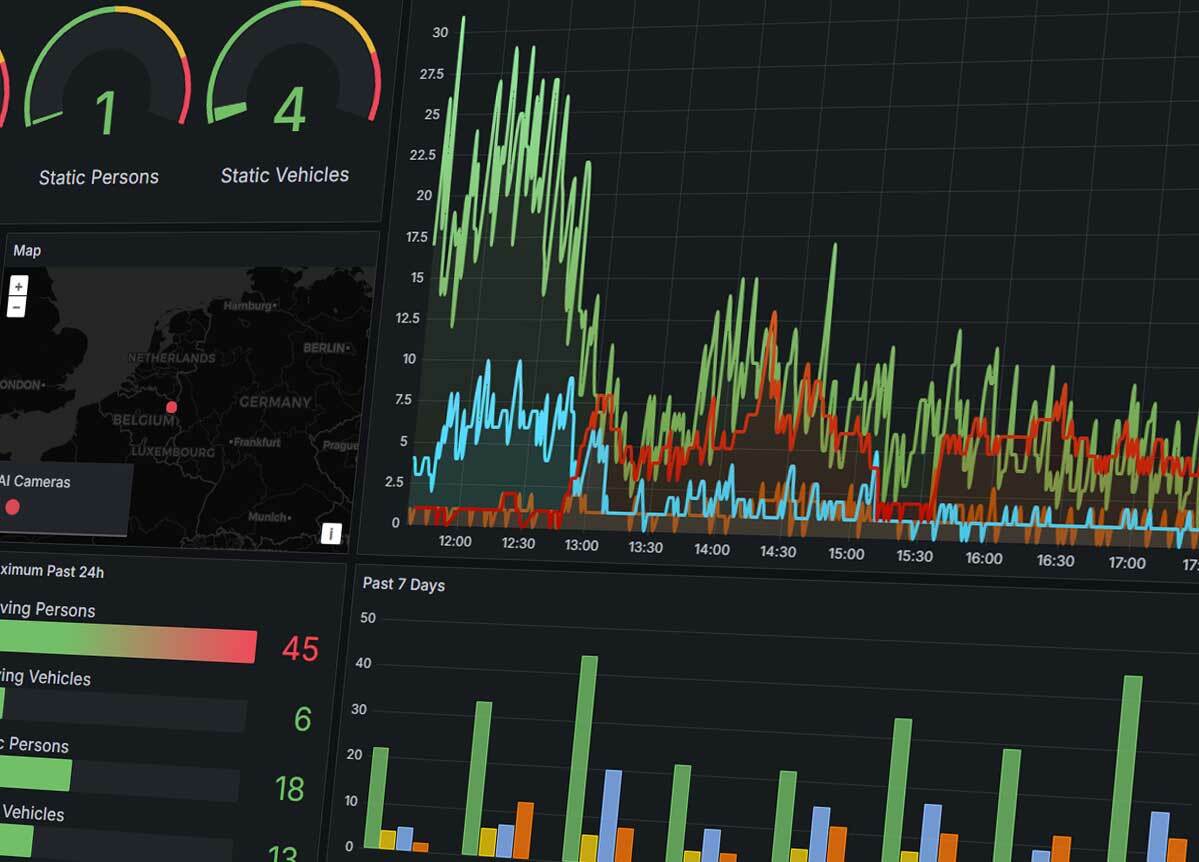 With our dashboards, customers can view and analyze collected data in an organized manner. Real-time monitoring, custom reporting, and advanced visualization make it easy to gain insights and identify trends. Our AI cameras provide a powerful tool for making data-driven decisions and optimizing security and efficiency.